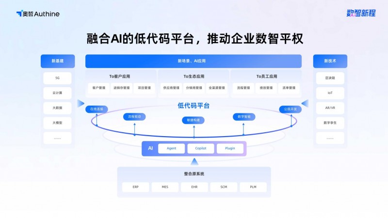 徐平俊表示:“低代码的底层逻辑是提升企业的应用开发效率、促进人人开发。以DeepSeek为代表的AI大模型正在加深这个逻辑,可以通过Agent、Copilot、插件等AI能力,跑在云平台上,快速整合历史系统与技术,实现各类AI场景,帮助企业组织智慧化转型。可以说,融合AI的低代码平台正在推动企业数智平权,从原先的企业数字化引擎升级为数智化引擎。”