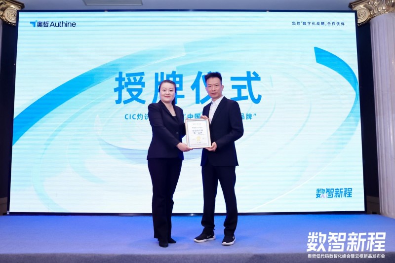 会议现场,国际权威咨询机构灼识咨询(CIC)合伙人朱悦向奥哲授予了“中国低代码第一品牌”证书,证实奥哲在2023至2024年度低代码产品收入位居低代码独立厂商榜首。