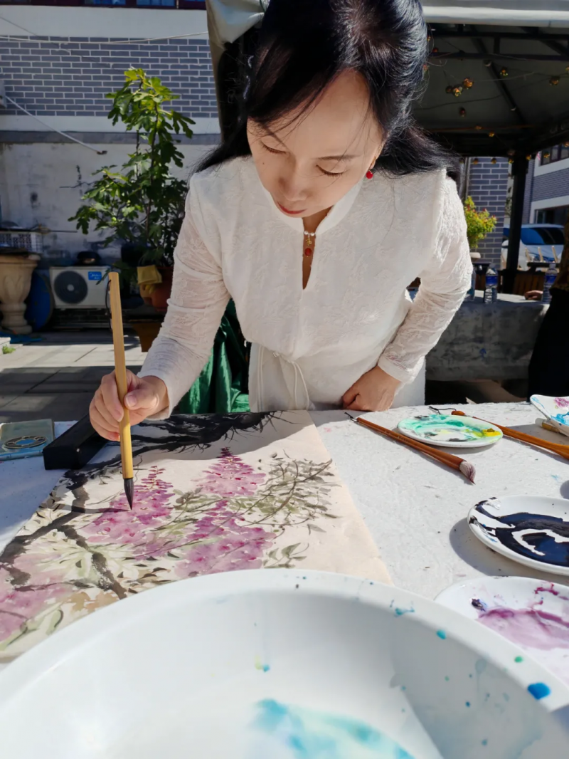 开幕式的高潮环节,当属艺术家现场笔会。曾春玲、弓淑英、李青枝、诗湘、张天鸣五位知名艺术家受邀亲临现场,他们围坐于庭院长桌前,铺展宣纸、研磨蘸墨,现场即兴创作。曾春玲女士以细腻笔触勾勒出山间秋景,枫叶红、银杏黄与远山青相映,尽显自然之灵;弓淑英女士的花鸟画,笔墨鲜活,花鸟情态灵动,尽显自然生机。李青枝绘花鸟,色彩雅致,笔触细腻,勾勒出灵动意趣。诗湘牡丹画,形神兼备,一花一蝶皆蕴独特艺术韵味。张天鸣篆书书法,线条遒劲,章法严谨,传递篆体古朴之美。五位艺术家在创作过程中墨色流转、笔法精妙,引得现场观众屏息观看,不少游客拿出手机记录下这精彩瞬间。创作完成后,艺术家们还与游客亲切交流,讲解作品背后的创作理念与技法,让大家近距离感受书画艺术的创作魅力。