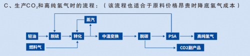 采用水蒸气转化+变换反应+PSA提纯流程,产品气纯度高。可根据用户不同的原料条件和产品要求设计最佳流程。