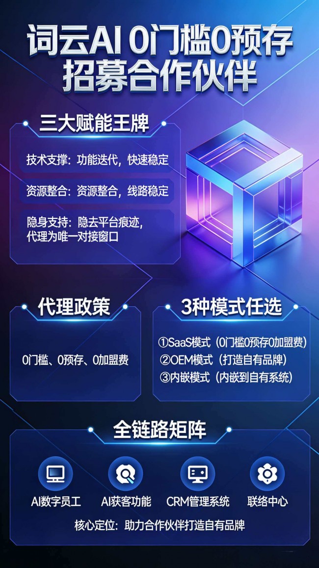 0 门槛代理政策是吸引全国伙伴加入的核心优势。【词云 AI 平台】SaaS 模式:全程 0 预存、0 加盟费政策,彻底免除前期资金压力,实现低风险轻创业。更值得一提的是,资金流转不经过总部账户,流程透明高效,确保代理商盈利足额到账。助力合作伙伴快速启动业务、轻松盈利,为全国代理商体系注入活力。